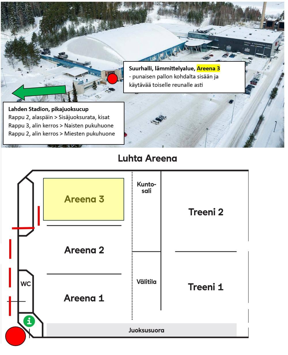 - Suurhallissa on varattu lämmittelyyn salibandykenttä, siellä ei saa käyttää piikkareita, Suurhallin juoksuradalle ei pääse