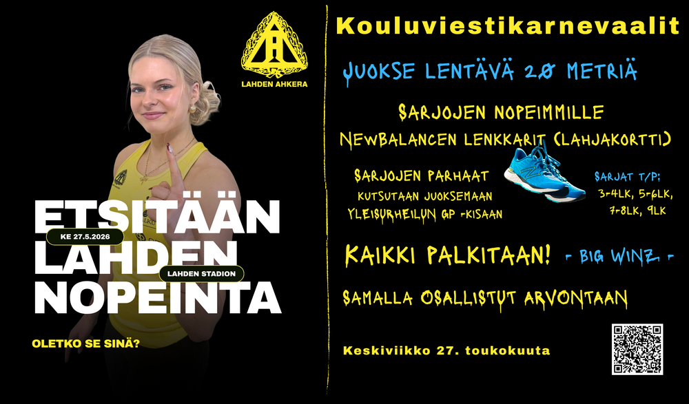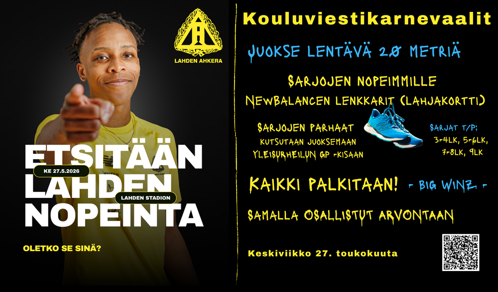 Palkintoina 1x 100€, 2x50€ lahjakortit Intersportiin ja 2x koko perheen lippupaketti Yleisurheilun Motonet GP Lahteen